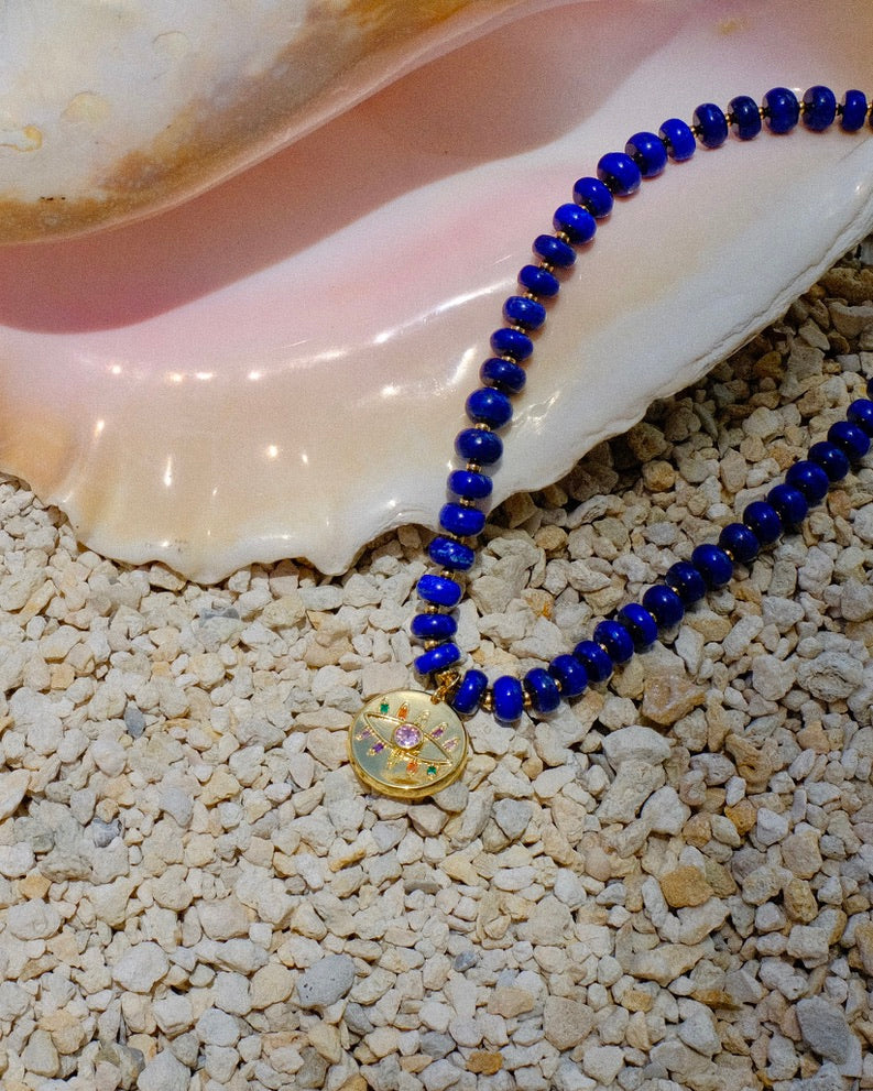 Channel bold energy and mystic charm with the Azul Necklace, featuring striking navy-blue lapis lazuli beads and a gold-plated evil eye medallion pendant adorned with colorful crystal inlays. Designed to stand out, this piece is both a statement of style and protection.