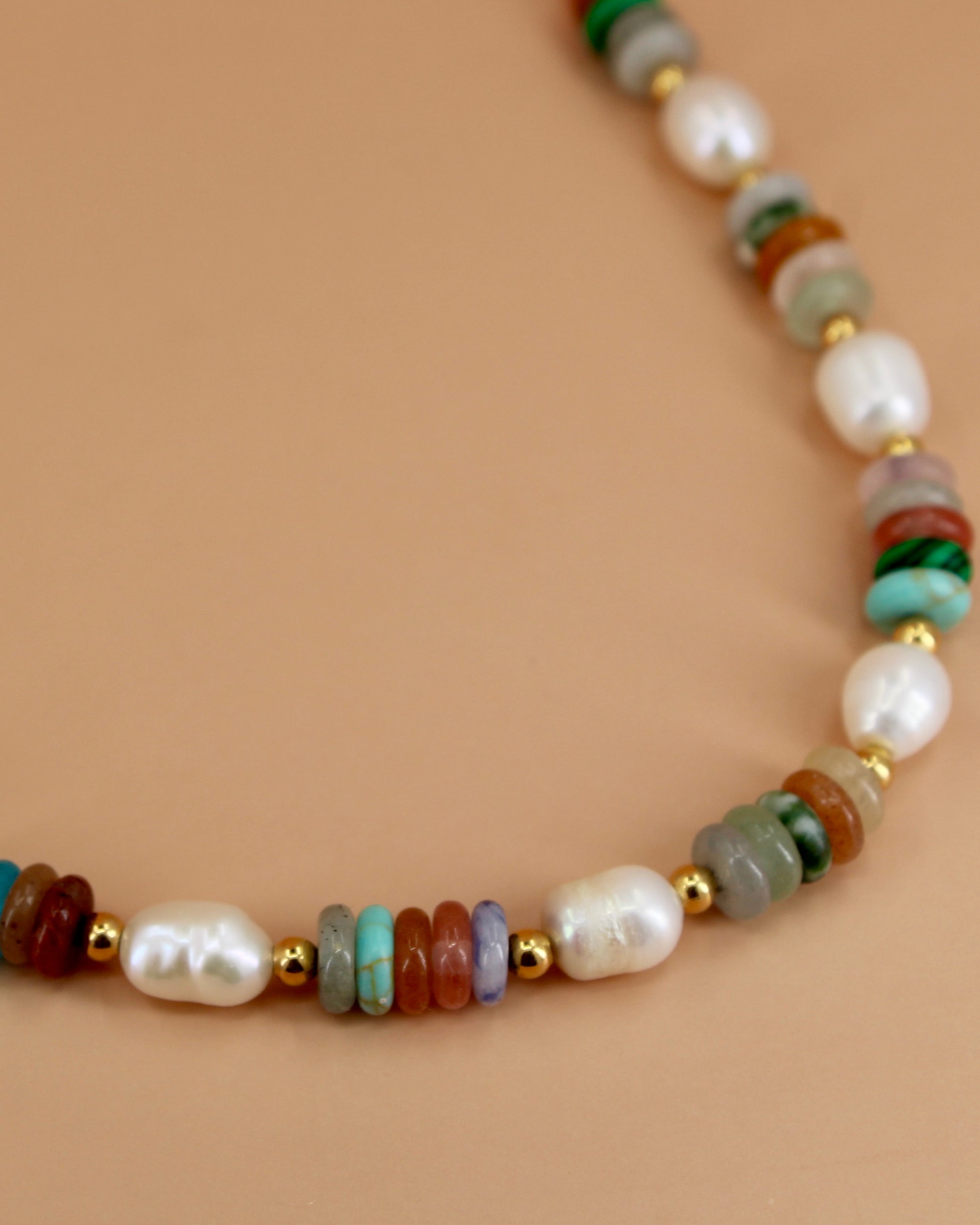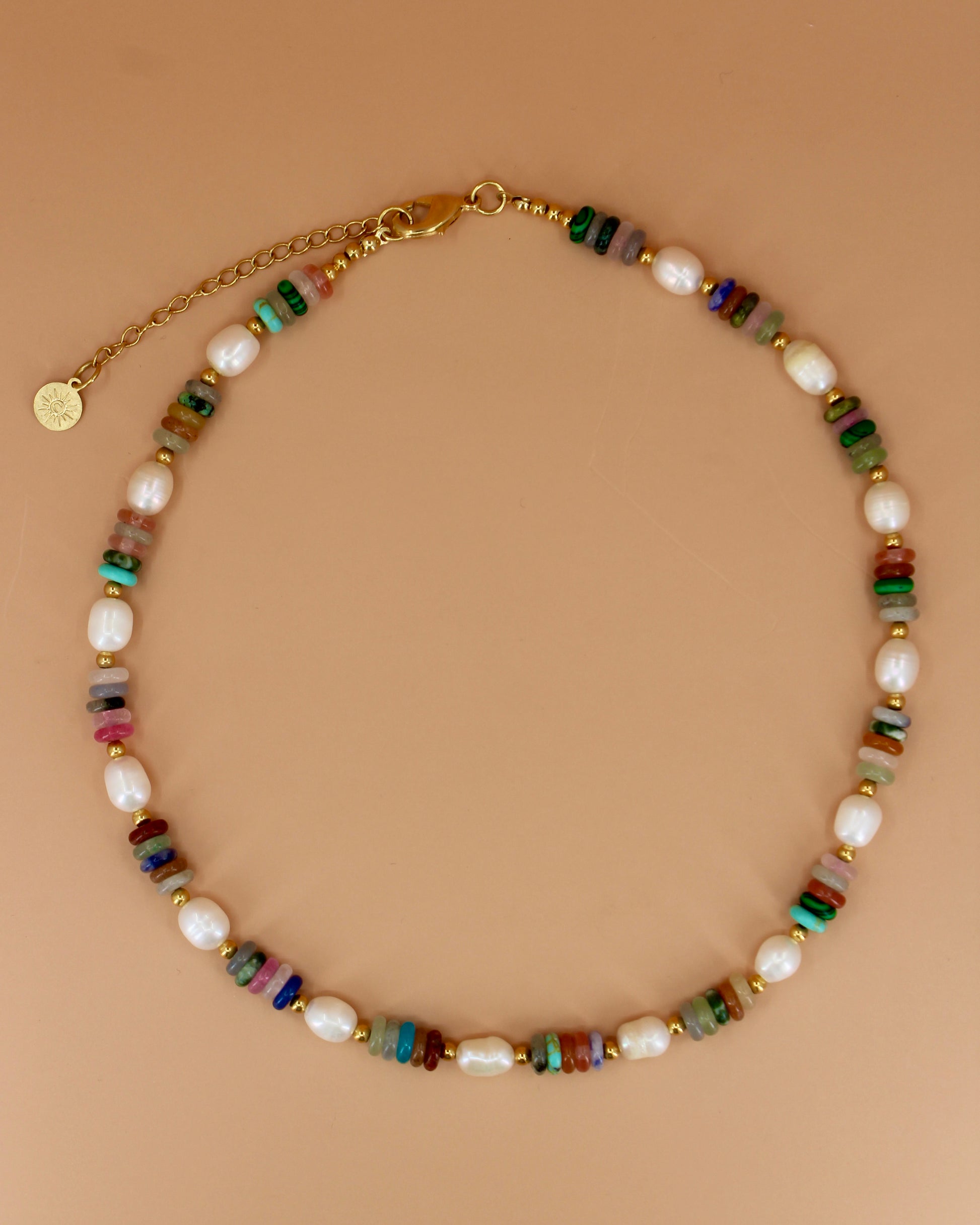 Add a pop of color and a whole lot of personality with The Indie Necklace. Handcrafted with colorful gemstone beads, natural freshwater pearls and finished with 18K gold-plated accents, this necklace brings together playful charm and statement-making style.
